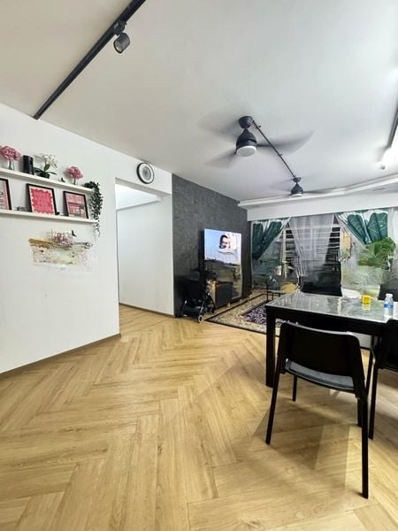 Step into this beautifully maintained HDB flat and feel the inviting ambiance created by its practical layout and modern finishes. The urban view floods the space with natural light, highlighting the sleek dark grey stone-effect cabinetry in the galley kitchen and the custom TV feature wall that adds a touch of sophistication.