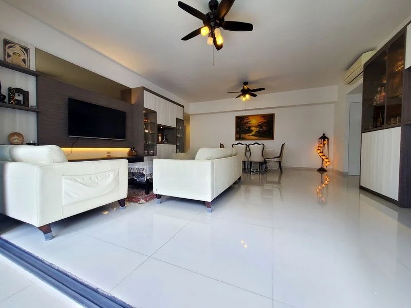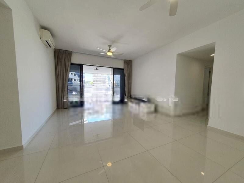 Step into a sanctuary of light and space at The Interlace, where abundant natural light pours through large windows, illuminating the bright and airy living area. The modern finishes, including a custom full-height TV console and elegant marble-patterned coffee table, create an inviting ambiance. Enjoy serene views of greenery and the city skyline from the comfort of your bay window seating.
