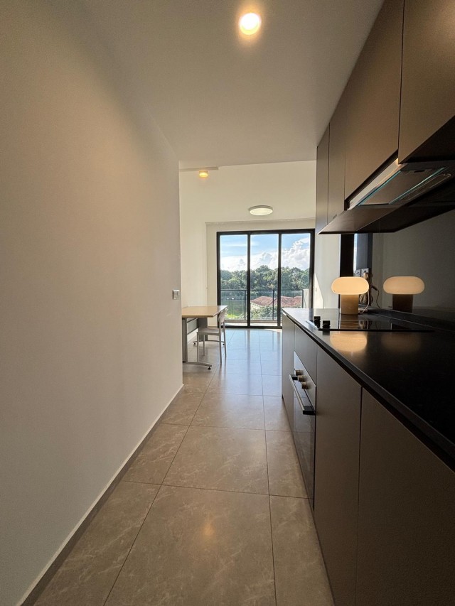 Step into a world of modern minimalism where natural light dances through the spacious living area, highlighting the sleek grey L-shaped sofa and light grey tiled flooring. The unblocked views of lush greenery and a charming colonial building from the balcony create a serene ambiance, inviting you to unwind in this well-maintained sanctuary.