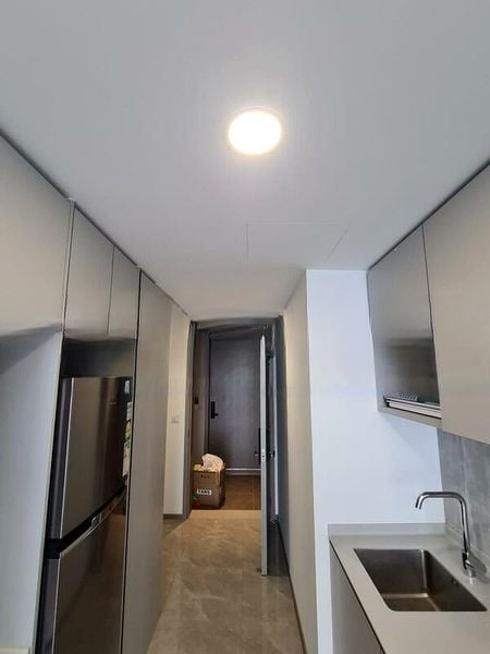 Step into this exquisite 1-bedroom unit at The Garden Residences and be greeted by abundant natural light pouring through the floor-to-ceiling windows. The double volume high ceiling creates an airy ambiance, while the polished tile flooring and geometric pendant light enhance the modern minimalist aesthetic. Enjoy breathtaking views of the city skyline from the comfort of your living space.