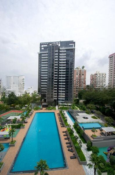 Step into a world of elegance and tranquility as you enter this beautifully renovated unit at The Trizon. Bathed in abundant natural light, the open-concept living area features polished marble flooring and floor-to-ceiling sliding glass doors that seamlessly connect to a spacious balcony, offering breathtaking views of the pool and city skyline. The modern minimalist ambiance creates a serene retreat, perfect for relaxation.