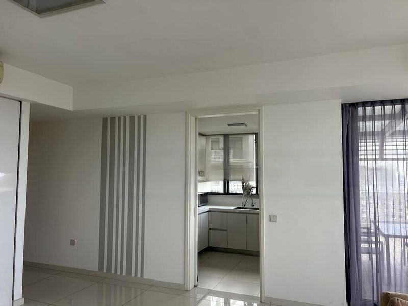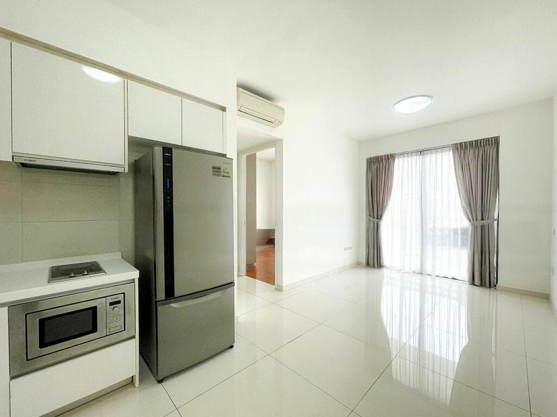 This thoughtfully designed 3-bedroom, 2-bathroom unit features a spacious living room adorned with large format floor tiles and a ceiling fan with integrated lighting. The galley kitchen boasts minimalist white cabinetry and built-in stainless steel appliances, seamlessly connecting to the utility area through a glass sliding door. The modern bathroom is a sanctuary of relaxation, complete with a tempered glass shower enclosure and natural ventilation.