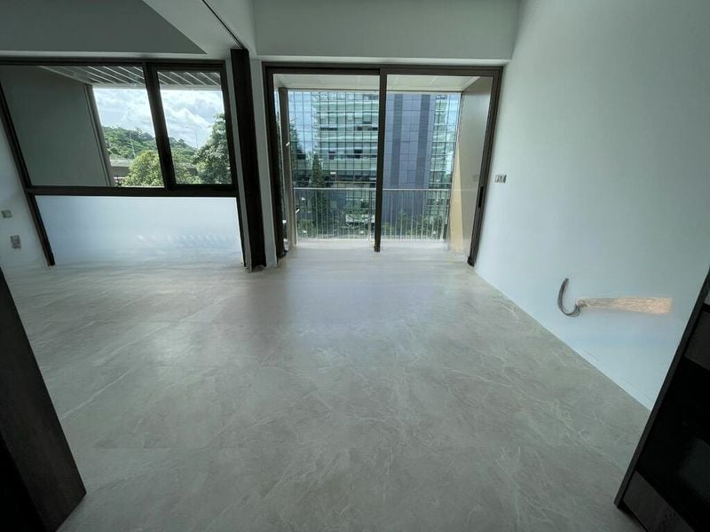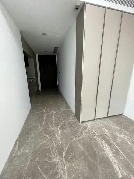 This well-maintained 1-bedroom unit features an open-plan layout, seamlessly connecting the living area to the balcony. The extensive built-in wooden storage and floor-to-ceiling cabinetry enhance the minimalist aesthetic, while the luxurious bathroom boasts marble-look wall tiles, a floating vanity, and a walk-in shower with a sleek dark glass partition. Every detail has been thoughtfully designed to elevate your living experience.