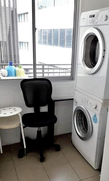 This well-maintained 2-bedroom condo features a thoughtful layout, with a modern galley kitchen showcasing black and white cabinetry and white countertops. The living room, adorned with minimalist furniture and a cozy dining nook, seamlessly connects to the balcony, perfect for entertaining. Each bedroom boasts wooden flooring and large windows, ensuring comfort and tranquility. Additional highlights include a stacked washer and dryer in the utility room and a compact study room, ideal for remote work or study.