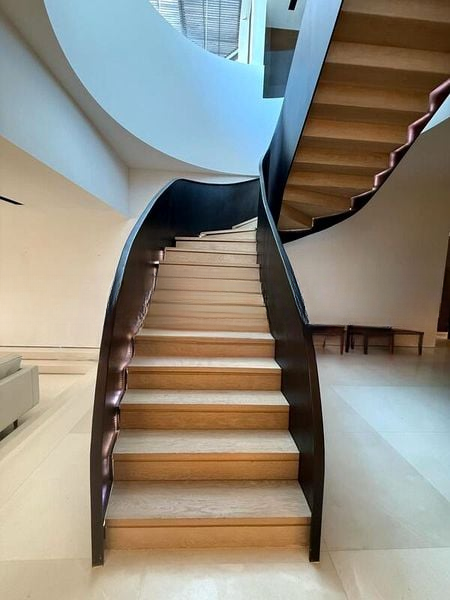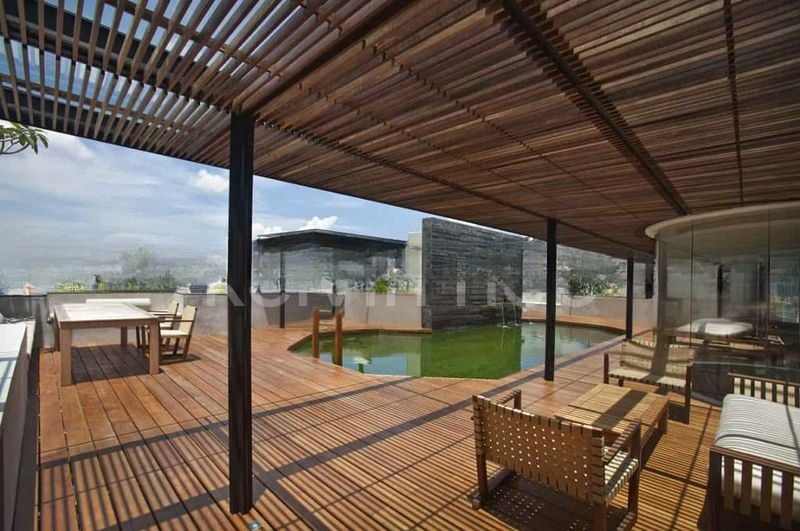 This expansive 5-bedroom, 6-bathroom unit boasts standout features including a sculptural spiral staircase, a freestanding designer bathtub, and a built-in floor-to-ceiling library with a rolling ladder. The open-concept living and dining areas seamlessly flow onto an extensive outdoor deck, complete with a private plunge pool and a timber slat ceiling, perfect for entertaining or unwinding in style.