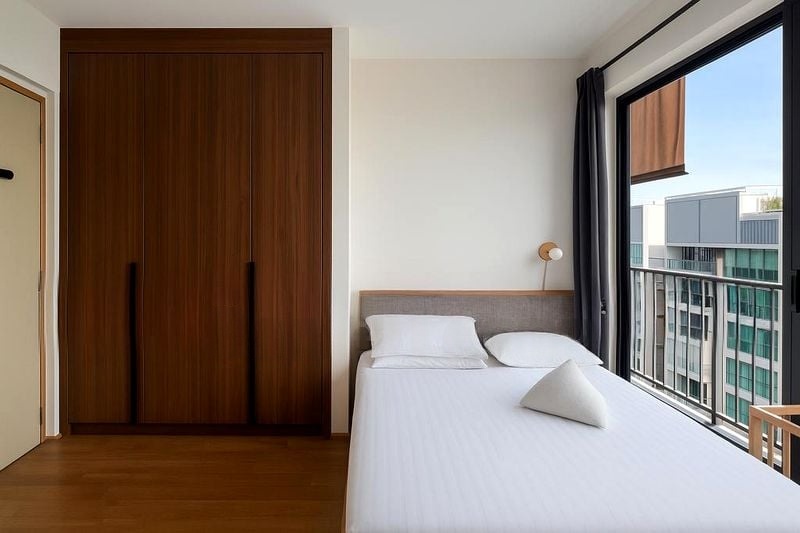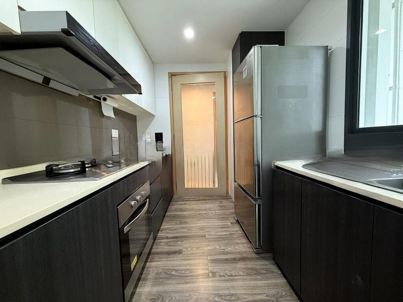 This efficient 77 sqm (829 sq ft) unit features a well-thought-out layout with two spacious bedrooms and two bathrooms. The master bedroom boasts warm wood flooring and a built-in wardrobe, while the second bedroom offers a built-in floating desk and vibrant pendant lighting. The galley kitchen is equipped with two-tone cabinetry and modern appliances, perfect for culinary enthusiasts. Enjoy your morning coffee on the balcony with unblocked views, or unwind in the elegantly designed bathrooms with marble-effect tiles and modern fixtures.