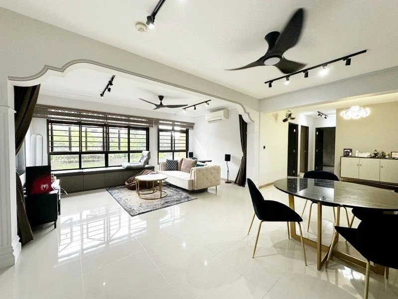 Step into this beautifully renovated HDB flat and be greeted by an abundance of natural light that floods the open-concept living space. The modern ambiance is accentuated by an orange accent wall, large windows offering stunning city skyline views, and wood-look flooring that adds warmth to the contemporary design.