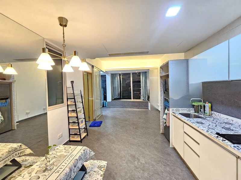 Step into this beautifully renovated 1-bedroom unit at Tribeca and be greeted by an abundance of natural light pouring through large floor-to-ceiling windows. The bright and airy ambiance is complemented by modern finishes, including wood flooring throughout and a stylish chandelier in the living room, creating a welcoming atmosphere that feels both spacious and intimate.