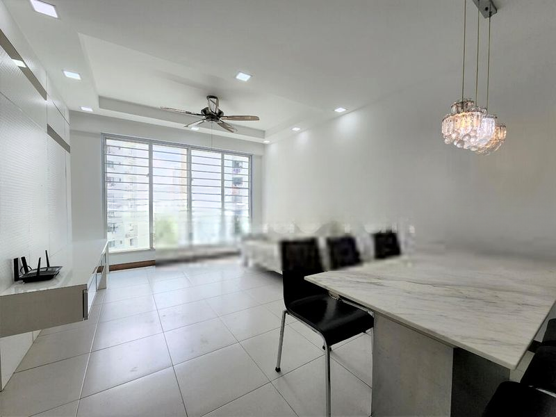 Step into a world of elegance as you enter this beautifully renovated 4-room HDB flat. The abundant natural light floods through large windows, creating a bright and airy ambiance that complements the modern finishes throughout. Admire the stunning marble-top dining table under the glow of crystal chandeliers, while the open concept living and dining area invites you to relax and entertain in style.
