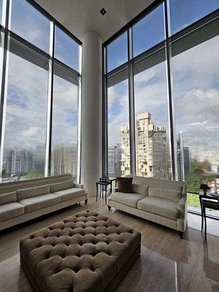 Step into a world of luxury as you enter this exquisite unit at The Marq on Paterson Hill. Bathed in abundant natural light, the double-volume ceiling and floor-to-ceiling glass windows create an airy ambiance, while the stunning city skyline and urban landscape views captivate your senses. Designer furnishings and a plush area rug in the living room add a touch of sophistication, complemented by a striking large-scale horse artwork.