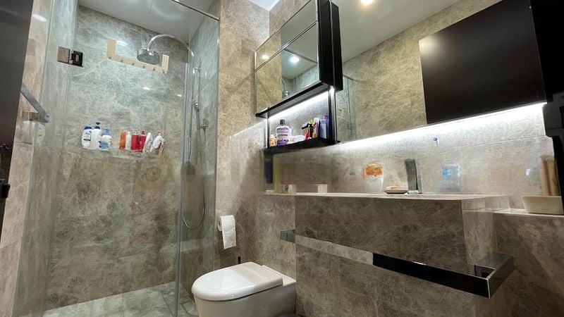 Step into a world of modern elegance as you enter this beautifully designed 2-bedroom unit at Martin Modern. Bathed in abundant natural light, the open-concept living area features marble-patterned floor tiles and floor-to-ceiling sliding glass doors that frame breathtaking views of the city skyline and lush greenery. The ambiance is enhanced by stylish pendant lighting and a sleek modern ceiling fan, creating a welcoming atmosphere.