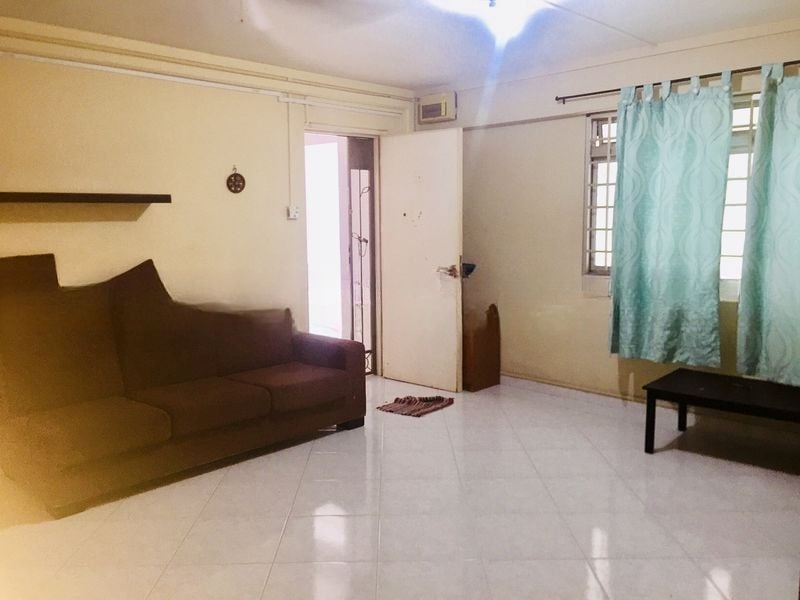 Step into a warm and inviting space where natural light gently illuminates the cozy interiors of this well-maintained 2-bedroom HDB flat. The open layout seamlessly connects the living and dining areas, featuring an L-shaped floral sofa and a stylish dining table adorned with a floral tablecloth. Floor-to-ceiling built-in wardrobes and extensive cabinetry provide ample storage while offering a tranquil view of lush greenery outside.