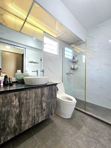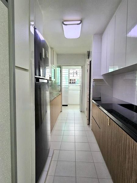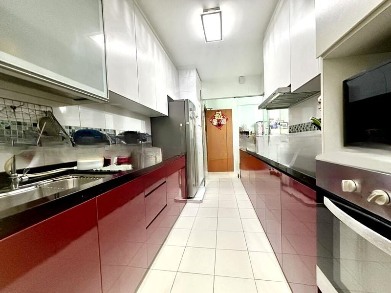 Step into this beautifully renovated 3-bedroom flat and be greeted by a modern ambiance that seamlessly blends functionality with style. The high-gloss red and white kitchen cabinetry, complemented by sleek black solid surface countertops, creates a striking first impression. Natural light filters through large windows, illuminating the open living space adorned with a false ceiling featuring cove lighting, enhancing the contemporary feel.