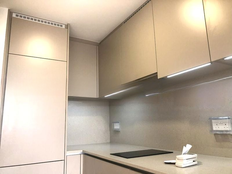This efficient 2-bedroom, 1-bathroom layout features standout elements such as a modern kitchen with quartz countertops and induction hob, a luxurious bathroom with a glass shower partition, and a cozy living room that opens to a balcony with panoramic high-floor views. The built-in sliding wardrobes and LED task lighting add a touch of contemporary convenience, making this unit perfect for modern living.