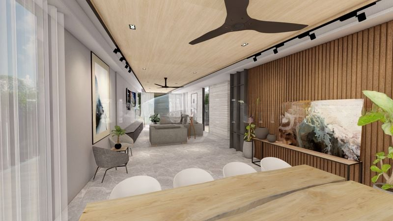 Step into a world of modern luxury as you enter this brand-new designer home, where abundant natural light floods through floor-to-ceiling glass doors, illuminating the exquisite marble-clad interiors. The open-concept living area, adorned with a striking wood-slat feature wall and elegant track lighting, seamlessly connects to lush greenery and the inviting private lap pool, creating a serene ambiance that feels both sophisticated and welcoming.