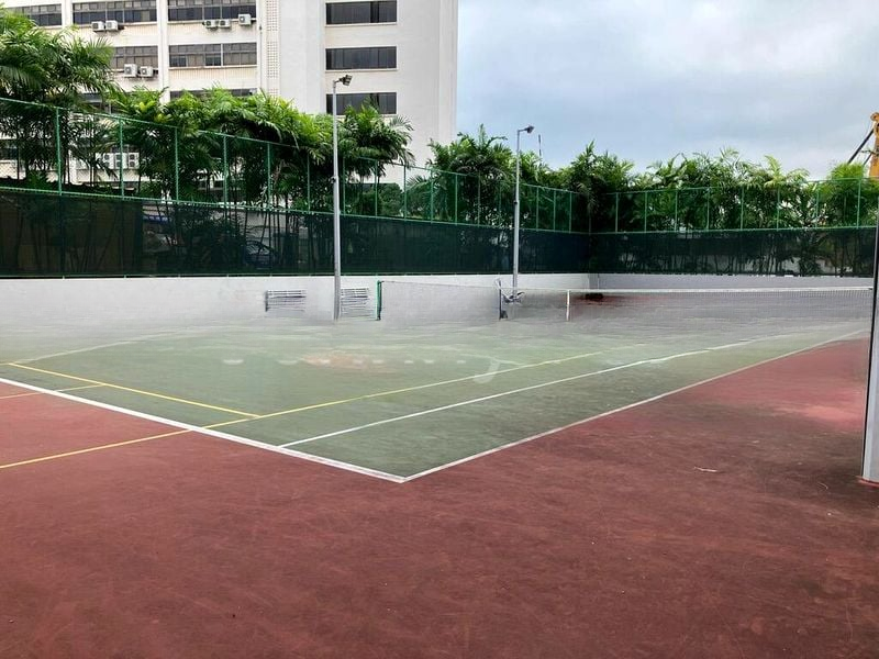 The well-maintained unit features a spacious layout with two comfortable bedrooms, each designed for relaxation. The master bathroom boasts a luxurious glass shower enclosure with a sliding door, complemented by dark mosaic wall tiles. Residents can indulge in the impressive amenities, including a lap pool, a fully equipped gym with a striking spiral staircase, and a floodlit tennis court surrounded by landscaped gardens.