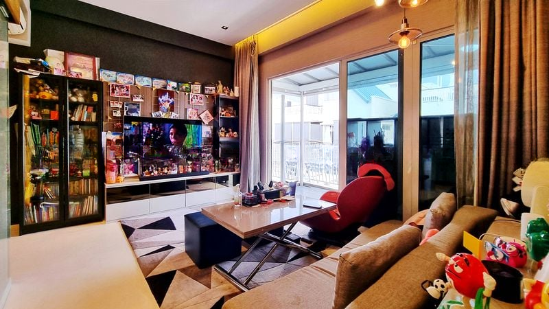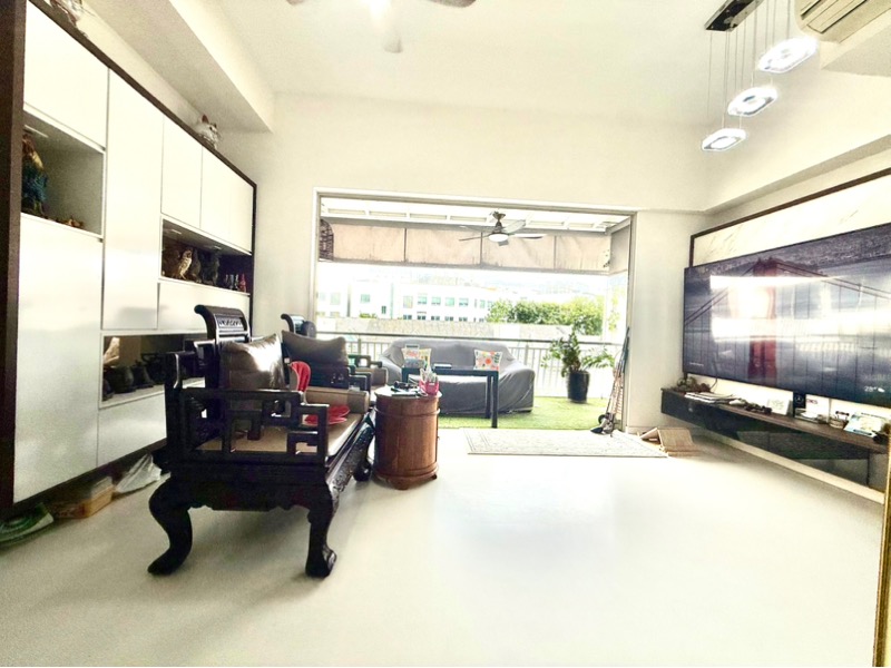 Step into a bright and airy sanctuary at Whitehaven, where abundant natural light floods the spacious living area, accentuating the elegant finishes and ornate traditional wooden furniture. The large balcony, adorned with artificial turf and outdoor seating, invites you to unwind while enjoying views of lush greenery and urban landscapes.