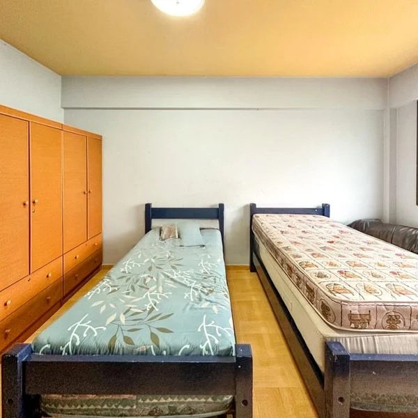 Step into a world of comfort and functionality in this spacious HDB flat, where the charm of original finishes meets the warmth of natural light filtering through the windows. The living room greets you with patterned tile flooring and vibrant green and yellow accent walls, complemented by a cozy wicker furniture set that invites relaxation. Enjoy views of lush greenery that enhance the tranquil ambiance of this lived-in home.