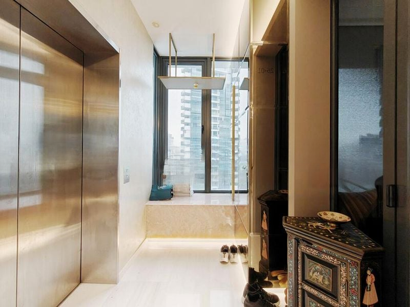 Step into a world of sophistication as you enter this well-maintained unit at Skyline 360. The abundant natural light floods the space, highlighting the luxurious marble flooring and the stunning circular recessed ceiling adorned with a crystal chandelier. Floor-to-ceiling windows frame breathtaking city skyline views, creating an ambiance that is both inviting and elegant.