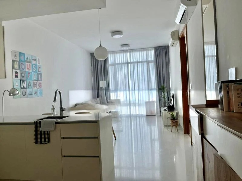 The well-designed layout includes a modern kitchen with an island counter, built-in oven, and minimalist cabinetry, seamlessly integrated with the dining area, perfect for entertaining. The spacious living room, equipped with a ceiling fan and split-unit air conditioning, offers a comfortable retreat after a long day. Enjoy the luxury of a central business district location with high-rise architecture that dazzles at night.