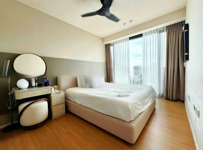 This well-maintained 3-bedroom condo features standout elements such as a striking spiral staircase leading to a loft study area, ideal for productivity. The master bedroom boasts integrated vanity and sheer curtains, while the second bedroom is thoughtfully designed as a nursery. The spacious living room is perfect for entertaining, complemented by a wall-mounted TV and stylish wall art.