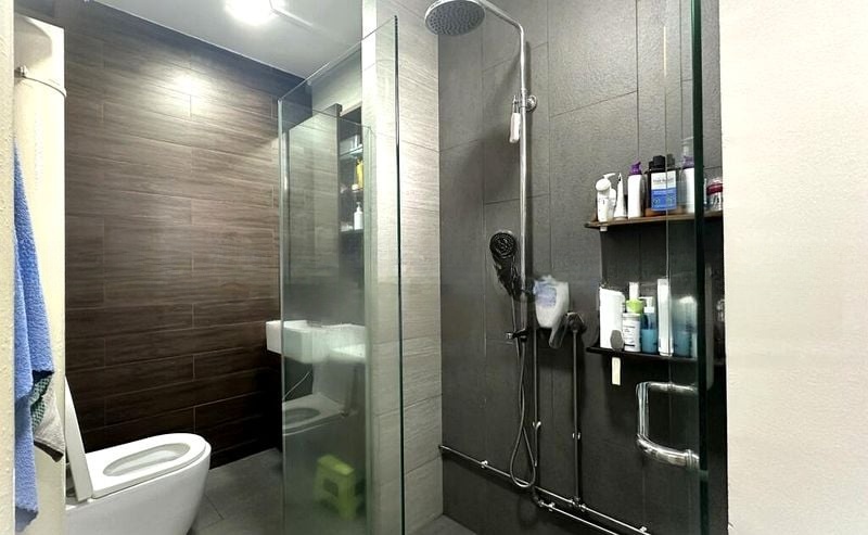 This 3-bedroom unit features standout elements such as a large floor-to-ceiling built-in wardrobe, a built-in study desk, and ceiling fans in each room. The bathrooms are equipped with safety grab bars, making it an elderly-friendly home. The tiled flooring throughout adds to the practicality, while the light pink and green accent walls offer a touch of warmth and personality.