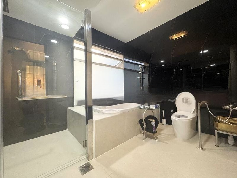 This meticulously renovated unit features a striking double-volume ceiling that enhances the sense of space. The gourmet kitchen boasts a stainless steel island, built-in appliances, and a stunning gold faucet, perfect for culinary enthusiasts. With four spacious bedrooms and four well-appointed bathrooms, this layout caters to both comfort and functionality, ideal for family living.