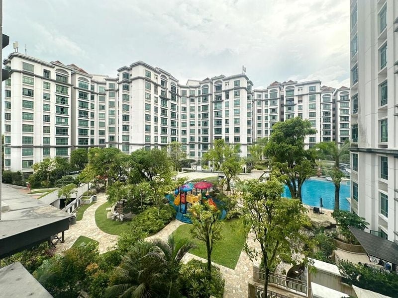 Step into a world of elegance and comfort as you enter this beautifully maintained 4-bedroom unit at The Hillside. The abundant natural light floods the living and dining area, highlighting the exquisite marble flooring and the sophisticated tray ceilings with recessed lighting. Enjoy serene views of the pool and lush greenery from your large windows, creating a bright and airy ambiance that invites relaxation.