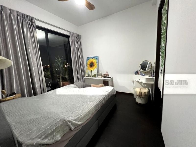 Step into a beautifully renovated unit at Spottiswoode Residences, where modern finishes and natural light create an inviting ambiance. The expansive living area opens up to a balcony with timber decking, offering unobstructed views of the pool, greenery, and the city skyline. Large windows draped with silver blackout curtains enhance the serene atmosphere, making it a perfect retreat.
