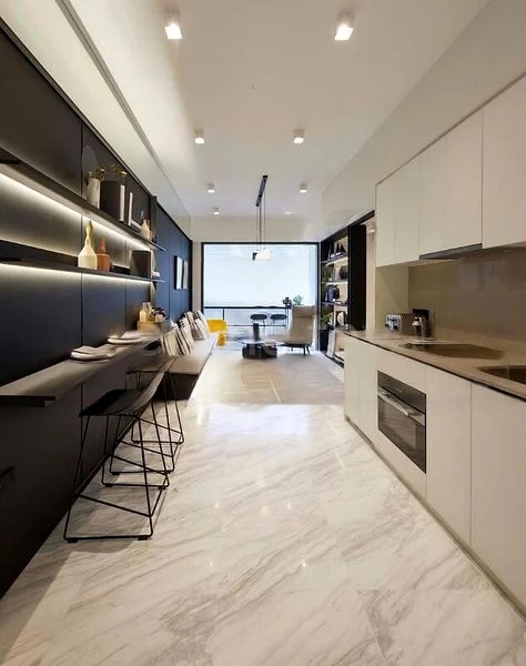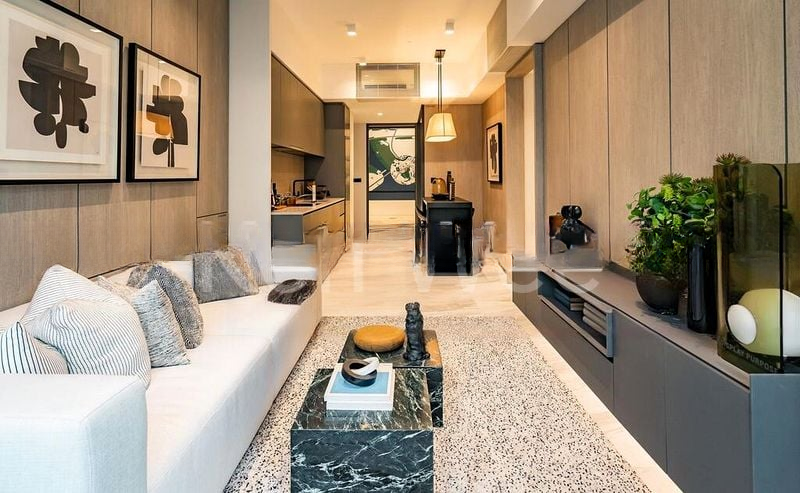 This efficient 1-bedroom layout boasts standout features such as a sleek kitchen with integrated appliances and a breakfast bar, a luxurious bathroom adorned with full marble tiles and a rain shower, and a cozy bedroom with a designer headboard and glass partition shelving. The living room seamlessly connects to a private balcony, offering unobstructed views that enhance your living experience.