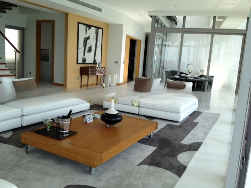 This spacious 3-bedroom, 5-bathroom condominium boasts standout features including a large kitchen island with an integrated cooktop, sleek dark cabinetry, and glossy white countertops. The luxurious master suite features a walk-in shower with a glass partition, while the living area is adorned with recessed lighting and pendant fixtures, perfect for entertaining. The glass balcony railing enhances the seamless connection between indoor and outdoor spaces, offering a tranquil retreat.