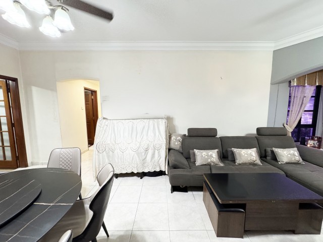 Step into a warm and inviting atmosphere where modern elegance meets comfort. The well-maintained unit features a cozy living room adorned with an L-shaped sofa, a bay window that invites natural light, and a large TV console, creating the perfect space for relaxation and entertainment. The dining area impresses with a striking black marble-top table, complemented by modern upholstered chairs, setting the stage for memorable gatherings.