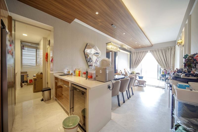 This well-maintained 2-bedroom unit boasts a seamless layout, featuring a spacious living room adorned with marble-look floor tiles and a large L-shaped sofa, perfect for relaxation. The dining area, highlighted by modern pendant lighting and a sleek black glass-top table, flows effortlessly into the stylish kitchen, equipped with white minimalist cabinetry, integrated appliances, and a breakfast bar with overhead glass shelving for added convenience.