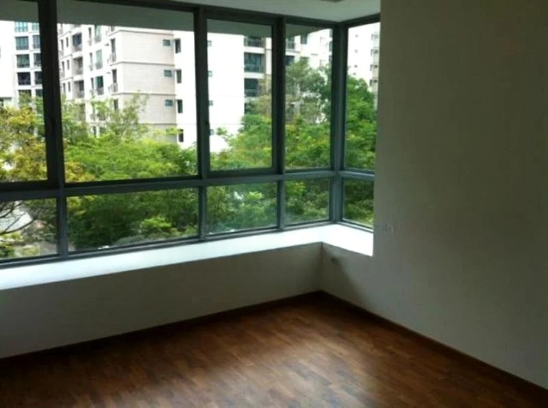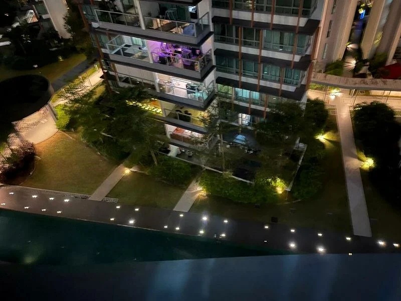 Step into a serene oasis at Double Bay Residences, where the inviting ambiance envelops you in warmth. The well-maintained unit features a raised wooden platform adorned with tatami mats, offering a unique touch of elegance. Natural light filters through venetian blinds, illuminating the open-concept kitchen and living area, while views of the landscaped garden and pool create a tranquil backdrop.