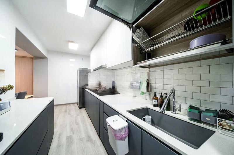 Step into a world of modern elegance as you enter this beautifully renovated 2-bedroom flat at 308C Punggol Walk. The herringbone wood-look flooring guides you through the entrance foyer, leading to a bright living space adorned with custom floor-to-ceiling wardrobes and integrated LED headboard lighting. Large windows frame stunning views of the city skyline and lush greenery, creating an inviting ambiance filled with natural light.