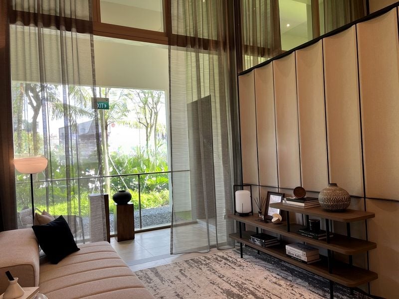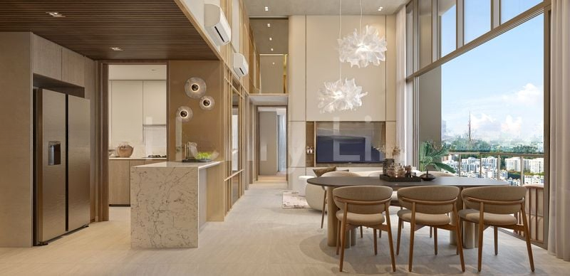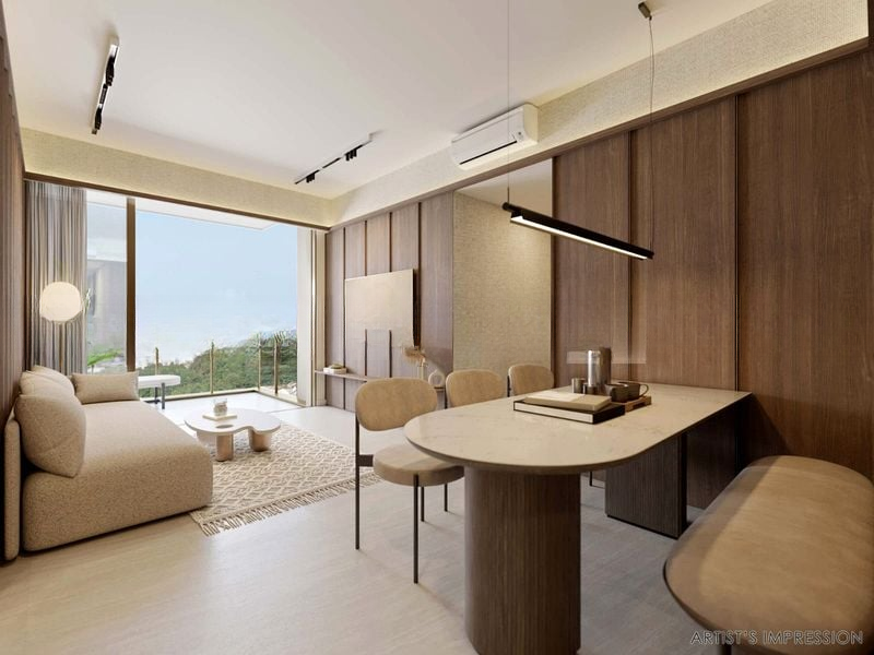 Step into a world of elegance as you enter this brand-new, designer condominium at Hillhaven. The abundant natural light floods through the floor-to-ceiling windows, illuminating the open-concept living space adorned with wood-paneled walls and modern minimalist furniture. Enjoy breathtaking views of lush greenery, the infinity-style pool, and the city skyline, creating a serene ambiance that invites relaxation.