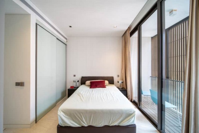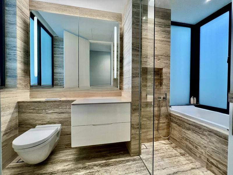 Step into a world of modern elegance as you enter this beautifully renovated unit at Lloyd Sixtyfive. The abundant natural light floods through the floor-to-ceiling glass sliding doors, creating an inviting ambiance that perfectly complements the urban cityscape views. The minimalist design, highlighted by large format floor tiles and a grey tufted sofa, sets the tone for sophisticated living.