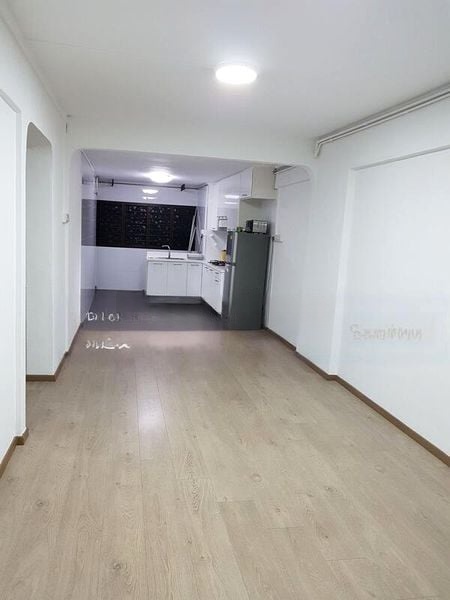 Step into this inviting 3-room HDB flat, where cozy warmth envelops you from the moment you enter. The living room features elegant tiled flooring and dark wood crown molding, complemented by a charming oriental-style red cabinet that adds character. Natural light filters through large windows, offering pleasant views of the residential surroundings, creating a serene ambiance.