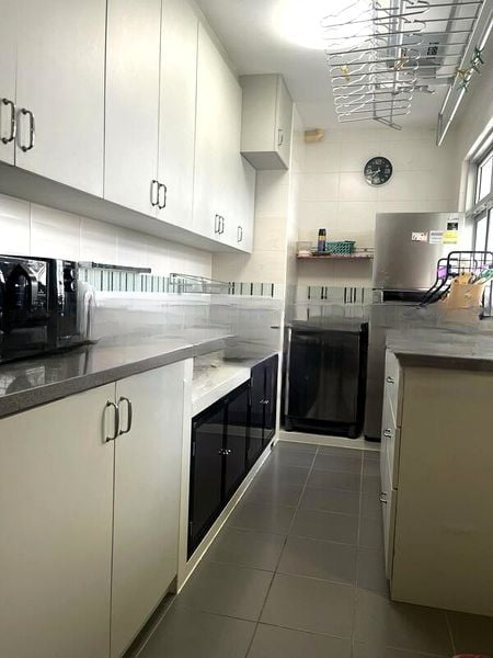 Step into this inviting 1-bedroom flat, where abundant natural light bathes the cozy living space, accentuating the warm wood-look vinyl flooring and the stylish finishes throughout. Large windows offer unblocked views of lush greenery and the surrounding HDB estate, creating a serene ambiance that feels like a retreat from the bustling city.