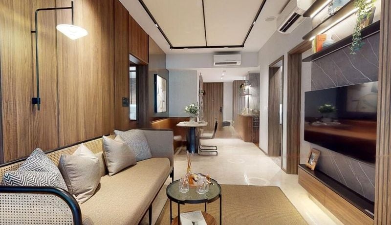 Step into a world of modern elegance as you enter this brand-new designer unit at St Nicholas View. The warm ambiance is enhanced by natural light filtering through large windows, showcasing lush greenery and a vibrant street view. The exquisite finishes, including wood-paneled feature walls and marble-look bathroom tiles, create a sophisticated yet inviting atmosphere.