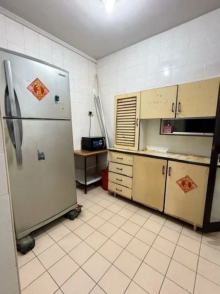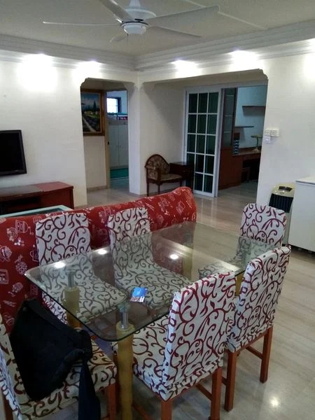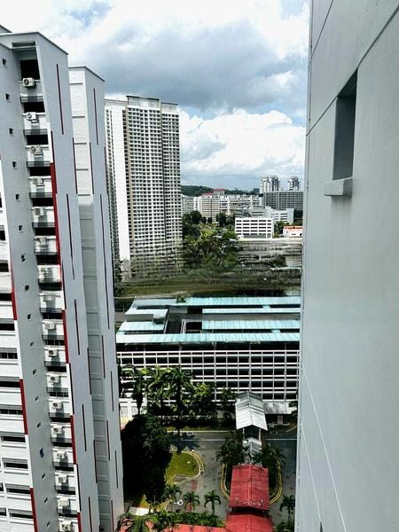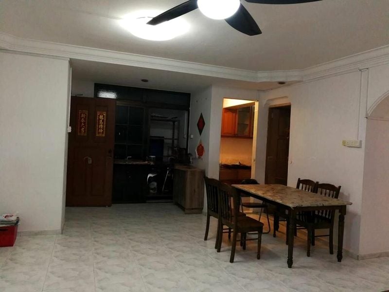 Step into this inviting HDB flat where traditional charm meets functional living. The moderate natural light filters through the black metal window grilles, illuminating the extensive built-in cabinetry and the elegant round marble-top dining table, creating a warm and welcoming ambiance. Enjoy views of lush greenery and nearby residential buildings, enhancing the serene atmosphere of your new home.