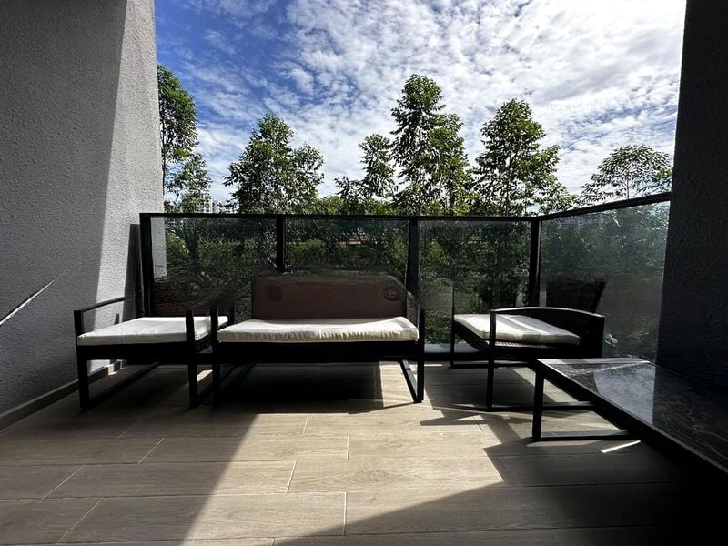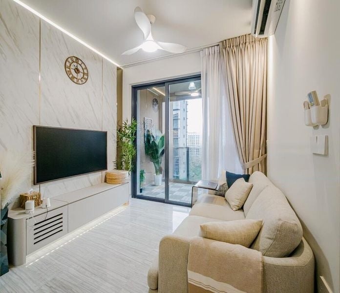 Step into this beautifully designed 2-bedroom unit at PARC ESTA and be greeted by an abundance of natural light cascading through the large windows, illuminating the modern minimalist finishes throughout. The geometric mirrored feature wall and marble-look TV backdrop create an inviting ambiance, while the balcony offers a serene escape with views of the city and surrounding greenery.
