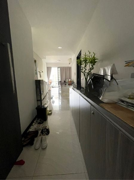 Step into this well-maintained 2-bedroom unit at GEM RESIDENCES, where you are greeted by a functional and compact ambiance. The polished tile flooring in the hallway leads you through an open-concept living room, seamlessly connecting to a modern kitchen adorned with two-tone cabinetry and integrated appliances. Large windows invite moderate natural light, offering serene views of lush greenery and urban residential buildings.