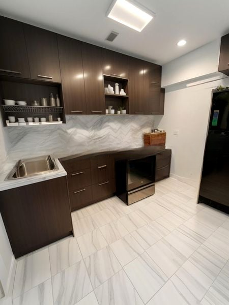 This efficient point block unit boasts a well-thought-out layout with three spacious bedrooms, including an en-suite master bedroom. The kitchen is a highlight, featuring dark wood cabinetry, marble-look countertops, and an integrated oven, perfect for culinary enthusiasts. A dedicated store room and service balcony add practicality to this stylish home.