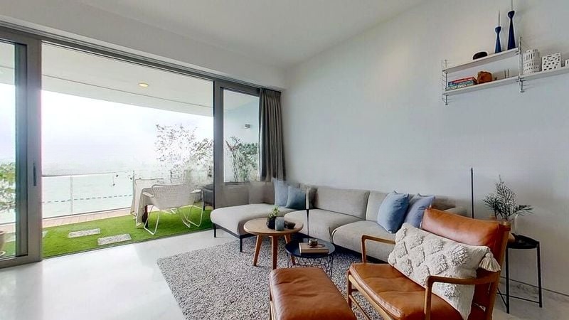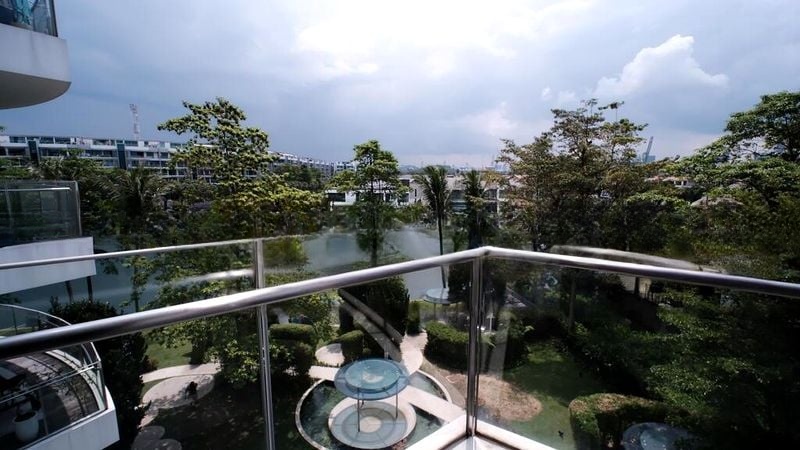 Step into a bright and airy sanctuary at The Coast at Sentosa Cove, where abundant natural light floods the space through floor-to-ceiling glass sliding doors. The polished white marble flooring and modern finishes create an elegant ambiance, while the expansive curved balcony offers breathtaking views of the pool, greenery, and waterway, inviting you to unwind in style.