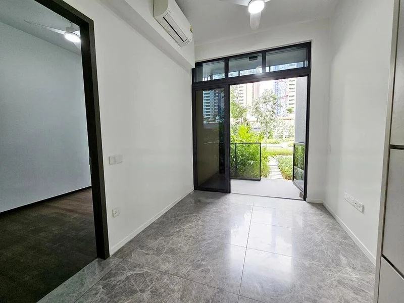Step into a sanctuary of modern elegance at THE M, where abundant natural light floods the space through an L-shaped corner window, illuminating the sleek marble-look floor tiles. The open-concept layout invites you to experience a seamless flow between the living area and the balcony, offering serene views of lush greenery and neighboring high-rises.