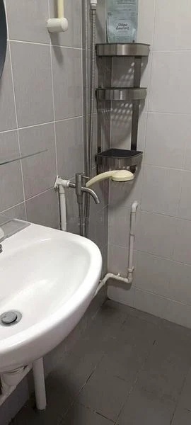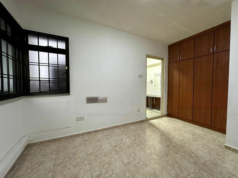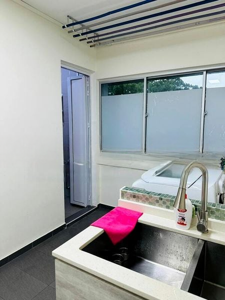 This thoughtfully designed unit features a spacious layout with built-in dark wood wardrobes in the bedrooms, providing ample storage. The kitchen is equipped with grey cabinetry and essential appliances, including a stainless steel double sink and a ceiling-mounted drying rack for convenience. The bathrooms are fully tiled and fitted with safety grab bars and instant water heaters, ensuring both comfort and safety.