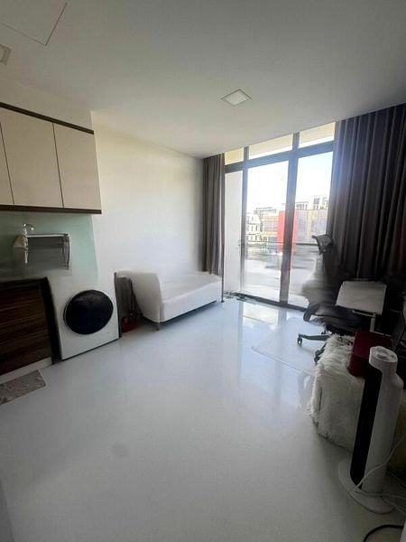 The open-concept living room features sleek white tiled flooring and seamless access to a private balcony, ideal for relaxation. The modern kitchen is equipped with an integrated washing machine, dual-tone cabinetry, and stainless steel appliances, making it both functional and stylish. The bedroom boasts dark wood flooring, a built-in wardrobe, and a large window that enhances the tranquil atmosphere. The bathroom is a highlight, featuring full-height stone-look tiles and a glass shower partition, exuding luxury.