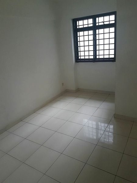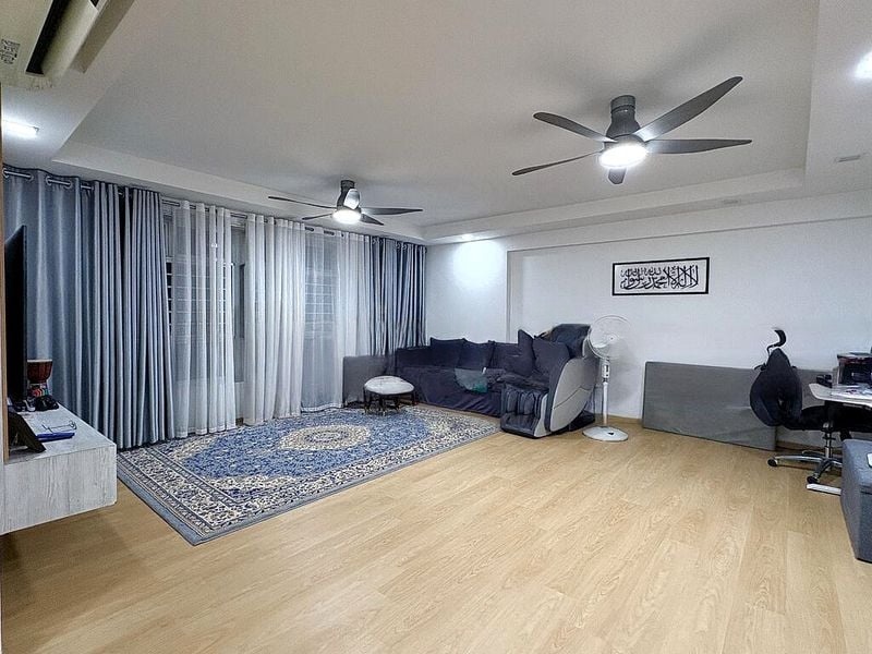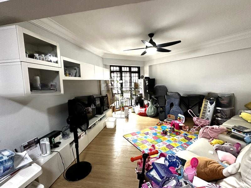 Step into this spacious HDB flat and feel the simplicity of its functional layout. The living and dining area, adorned with white tiled flooring, is enhanced by a striking glass block wall feature that allows natural light to filter through, creating a warm ambiance. Slide open the glass door to the balcony, where you can enjoy urban views and fresh air, perfect for relaxation.