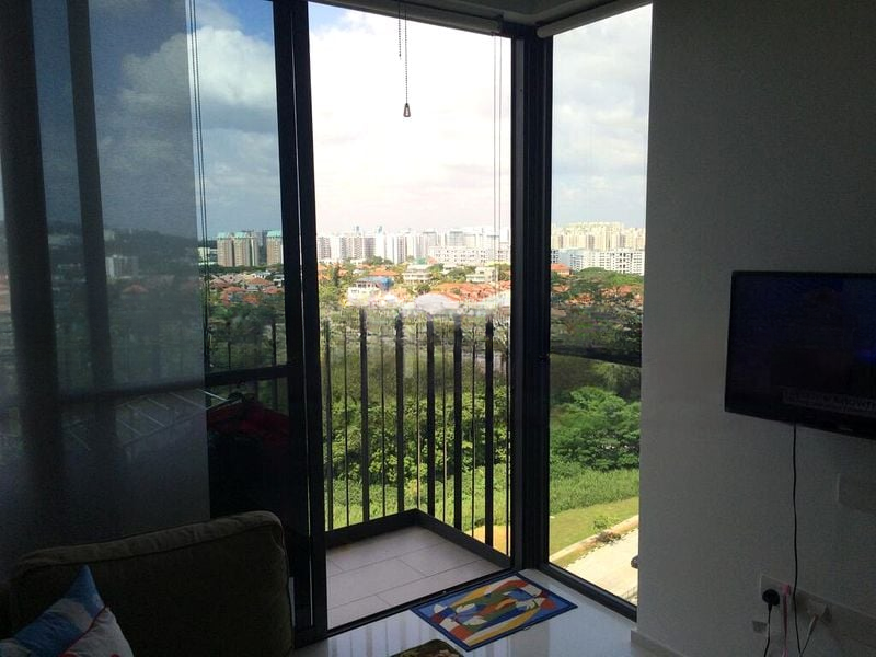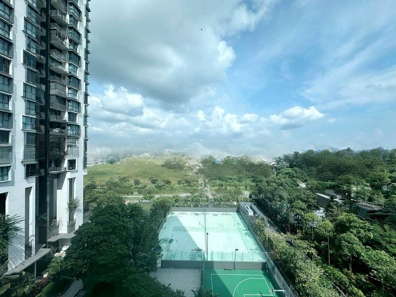Step into this beautifully renovated unit at Foresque Residences and be greeted by an abundance of natural light that fills the space, enhancing the bright and airy ambiance. The living room, adorned with an L-shaped leather sofa and a wall-mounted TV, seamlessly connects to a balcony through sliding glass doors, offering stunning views of the city skyline and lush greenery.